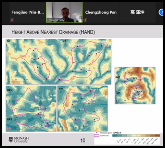 Edoardo Daly博士围绕“Water balance of intermittent headwater catchments with contrasting land-uses Observations and modelling” 主题展开讲座,介绍了在澳大利亚东南部维多利亚州的三个不同的地质环境中开展的水平衡驱动因素实验,实验结果表明地形、地质、气候的不断变化以及土地利用的改变都可能对流域水平衡产生影响。同时还对CATchment Hydrology(CATHY)模型进行了校准,并探索了各种情景,以确定降雨、地形和植被面积之间的联系。来自中文无码 、清华大学、北京林业大学以及萨斯喀彻温大学、苏黎世大学、圣路易斯国立大学等多所院校的五十余位专家教授、硕博士研究生聆听了本次讲座,会后Edoardo Daly博士还就大家关心的问题开展了交流讨论。