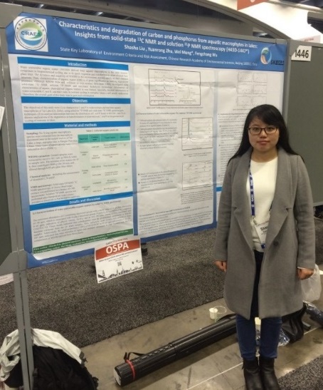 我院博士生刘沙沙的论文"Characteristics and degradation of carbon and phosphorus from aquatic macrophytes in lakes: insights from solid-state 13C NMR and solution 31P NMR spectroscopy"在分会场"Groundwater-surface water interactions:identitying and integrating physical, biological, and chemical processes across scales"以海报张贴的形式进行了展示。