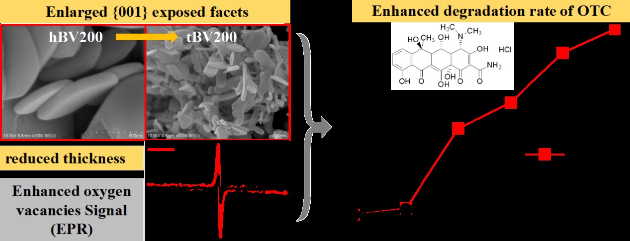 (第一篇文章介绍)以土霉素为代表的抗生素类污染物去除一直是生态环境保护领域的重要课题。该研究采用水热法合成新型薄片状纳米BiVO4光催化材料,在可见光条件下实现目标污染物土霉素的彻底光降解,避免了高毒性中间产物的生成。第一篇文章首次提出油酸钠作为晶面诱导剂,可控制备纳米片BiVO4光催化材料,提高了光催化材料优势暴露晶面的比例和氧缺陷活性反应位点浓度(图1)。制备的新型BiVO4材料表现出优异的光电转换效率、光催化性能和稳定性,并定向增强了自由基转化过程。本研究对于太阳能驱动的新型污染物去除技术研发具有重要意义。