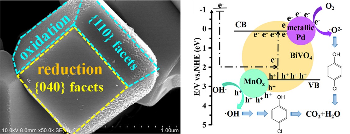 (第二篇文章介绍)以氯酚为代表的卤代有机化合物被广泛用于合成农药、杀虫剂、阻燃剂和染料等领域,具有高毒性、生物难降解以及“三致”等特性。第二篇研究论文采用光电催化技术有效的将氯酚污染物脱氯去毒并彻底氧化降解,具有降解效率高、成本低、稳定好等优点。通过无添加剂的水热法合成了具有氧化和还原特性暴露晶面的十面体BiVO4光电催化材料,并采用温和的光沉积方法将具有还原特性的Pd和氧化特性的MnOx纳米助催化剂选择性负载在对应的暴露晶面上,实现了光生电子空穴对的高效生成和定向传输(图2)。同时利用不同组合的复合光电催化材料考察了氯酚污染物的光电催化降解效率,研究了氯酚污染物的还原脱氯和氧化降解反应机制,阐明了助催化剂与十面体BiVO4的协同作用机理。本研究对卤代有机污染物的去除技术研发具有重要意义。