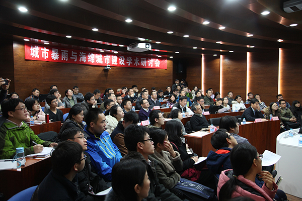 致词。开幕式结束后,我院创始人、首任院长刘昌明院士,清华大学贾海峰教授与中国水利水电科学研究院程晓陶副总工程师,先后以“城市水文:海绵城市”、“城市降雨径流LID-BMP布局优化及案例分析”与“海绵城市建设的困境与出路:良性互动+道法自然”为题作了精彩的学术报告。随后,中国城市规划设计研究院谢映霞副院长、东方园林生态股份有限公司朱庆平副总裁、华南理工大学黄国如教授先后应邀以“海绵城市建设与雨水综合管理”、“海绵城市建设的若干思考”与“城市暴雨内涝防控技术研究”为题作了特邀报告。最后,我院庞博副教授和左德鹏讲师先后介绍了徐宗学教授研究团队近年来在北京市自然科学基金重点项目“北京市典型区暴雨洪水模拟”与“北京市水生态现状调查及其健康评价”等方面的工作进展。会议热烈而紧凑,讨论广泛而深入,取得了良好的效果。原定40人左右的小型学术研讨会议规模,参加人员翻倍,不少年轻教师和研究生站在过道或门外倾听,可谓盛况空前。与会专家们积极展示自己的最新研究成果,并且充分深入地交流和讨论,互相分享研究心得和体会。此次学术研讨会的举办拓宽了年轻教师以及博士和硕士研究生们的学术视野,开阔了研究思路,为今后的学习和研究工作奠定了坚实的基础。