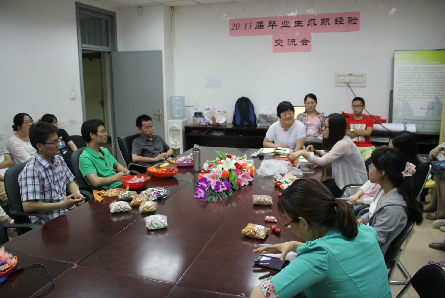 2013年6月4日晚,由研工部主办,我院生活指导室协办的"2013届毕业生求职经验交流会——求职面对面”在我院会议室成功举办。本次活动由我院生活指导室助管都莎莎主持,分别邀请张欣、张意、李帅冉、李三百、刘晓、范富强等毕业生交流了就业、考博、出国深造的经验。并特邀我院团委书记吕晓慧老师详细介绍2013届的就业。