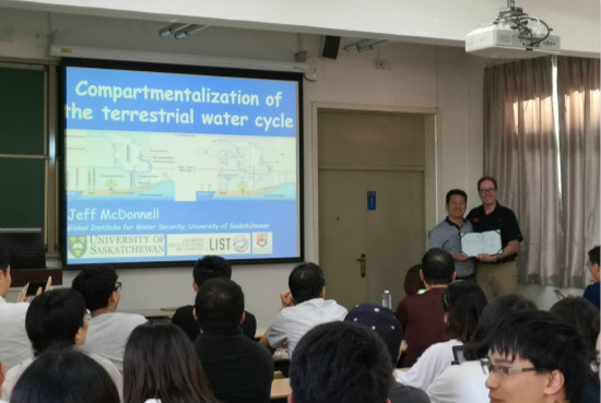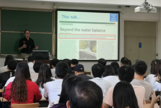 随后,Jeffrey McDonnell教授进行了题名为《Compartmentalization of the terrestrial water cycle》的学术报告。作为同位素水文学领域的研究专家,教授从自己在2017年的一篇文章中所得到的结论入手,从水量平衡方程的由来、地质学和生物学对流量的影响等角度向现场观众分享了自己对于陆地水循环的全新且深入的认识,并提出了对陆地水循环的新展望。紧接着,Jeffrey McDonnell教授的博士生Magali Nehemy作了题名为《How plant water status drive tree water source partitioning》的报告,从同位素水文学的角度分析了植物内生水在树木中的驱动效应。报告全程气氛轻松又引人入胜,观众们不仅听得津津有味,也在报告结束后积极地与教授和博士生交流报告中的问题,分享自己在中文无码中的见闻。