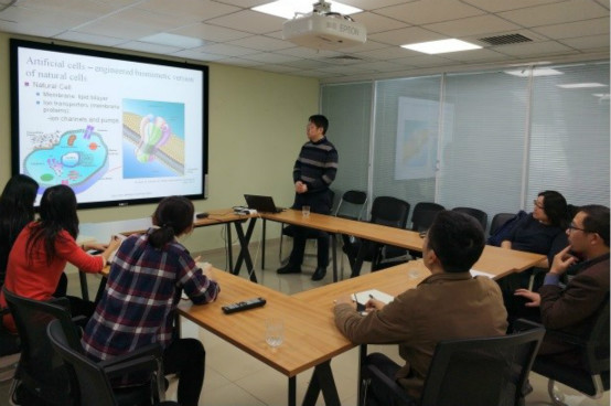 潘成忠老师主持了这次报告会,潘成忠老师首先向与会师生简要介绍了徐剑博士的基本情况,并对徐剑博士的到访表示热烈欢迎。随后,徐剑博士作了题为“Eco-friendly Energy Harvesting from Water”的学术报告。徐剑博士先将“污水-能源化-发电”的整体思路于开始点明,并就生物能为主要可再生清洁能源的统计结果引入报告内容。报告主要分为“动机”、“设计过程”、“总结”三部分。动机部分,利用仿生学的办法,模仿电鳗头部表层发电细胞的结构以及利用离子浓度高低的相似发电机理设计人工发电单元,并将其应用于污水发电或可植入医学元件的设计中。设计过程1,模仿电鳗发电细胞细胞膜的可激发半膜部分的独有钠离子通道,设计了微小膜电压刺激后“膜内Na+浓度增高-模电压升高”的正循环发电系统,设计得到了0.545 wm-2cell-1的发电效率。设计过程2,利用混合油脂溶液中两滴富含离子污水液滴之间的稳定脂质双层结构,利用特定离子通道及离子浓度差形成电压差来发电,发电效率6.9×106Jm-3是压电传感器的100倍,随后徐剑博士又就改进的水凝胶五液滴发电系统进行了引申降解。最后,徐剑博士对报告作了总结,表明报告的几种发电微单元可利用电荷选择性而非离子选择性应用于宏观上的工业废水及海水发电或者微观上的人工学仿生医学发电之中。